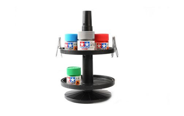This is a rotating two-tier paint jar stand that lets you organize your paints clearly for easy access. It can store up to 7 jars of acrylic "mini" (10 ml) or 6 jars of 23 ml paints per tray. Each tray has a small groove along its edge, allowing you to also use this as a drying stand simply by using alligator clips (4 included) to hold newly painted parts.